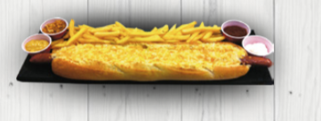 ES- Para compartir, espectacular hot dog de medio metro con salchicha de cerdo al grill , queso fundido , salsas y papas fritas.