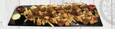 EN-Exquisite combination of diced sirloin, grilled chicken Breast and Chistorra with fries and coleslaw.